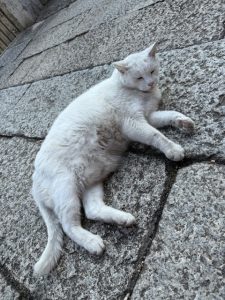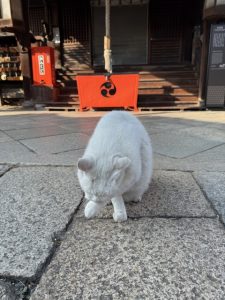 お賽銭を入れるところに、真っ白なネコちゃんがいました!
