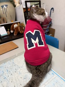 当社看板猫ももたろうはいろんな服を持っているのと、冬でとても寒いので最近よく服を着ております👔🎵
