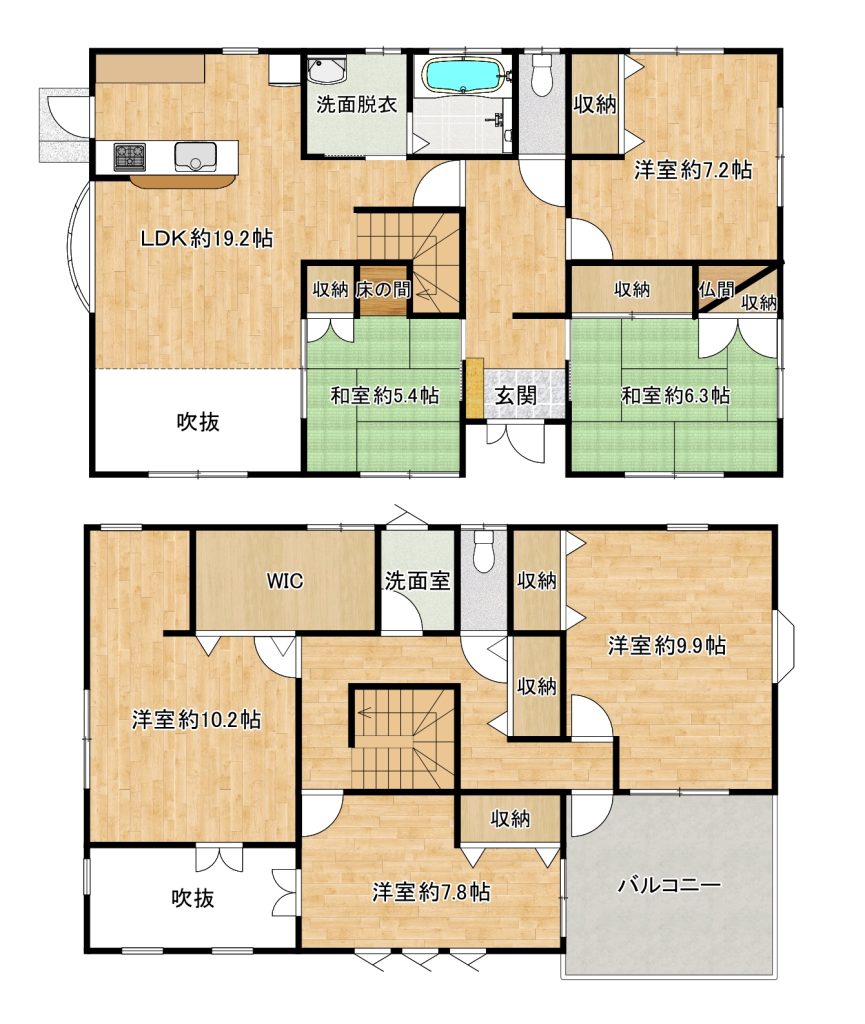 | 間取内容 | LDK19.2畳 1階 1室 洋室7.2畳 1階 1室 和室6.3畳 1階 1室 和室5.4畳 1階 1室 洋室10.2畳 2階 1室 洋室9.9畳 2階 1室 洋室7.8畳 2階 1室 S2階 1室 | ||