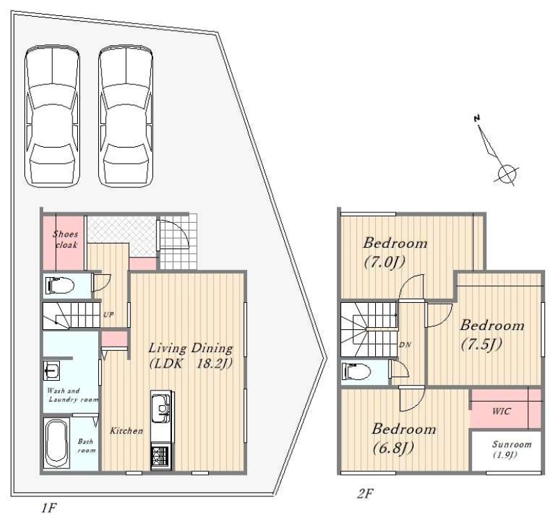 | 間取内容 | LDK18.2畳 1階 1室 洋室7.5畳 2階 1室 洋室7.0畳 2階 1室 洋室6.8畳 2階 1室 | ||