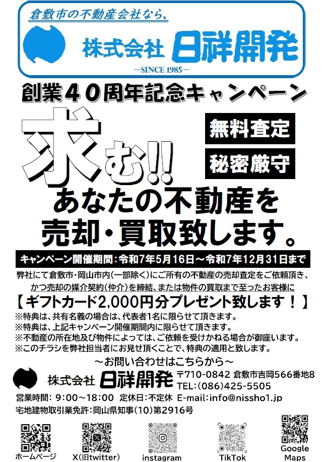 弊社にて倉敷市・岡山市内(一部除く)にご所有の不動産の売却査定をご依頼頂き、かつ売却の媒介契約を締結したお客様、物件の買取まで至ったお客様に